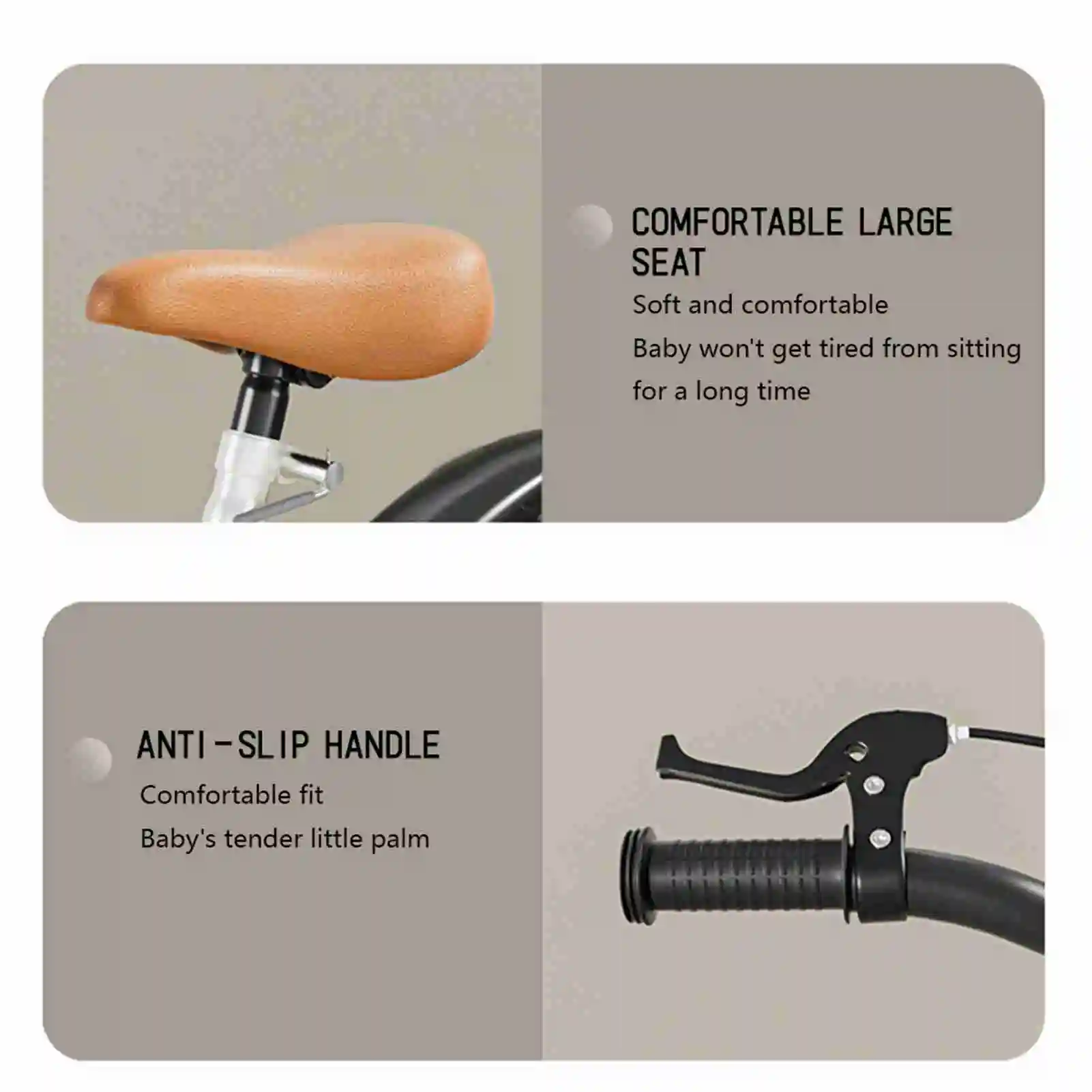 Frenos dobles sensibles: diseño de doble freno delantero y trasero, frenado estable, lo que garantiza la seguridad de los niños.