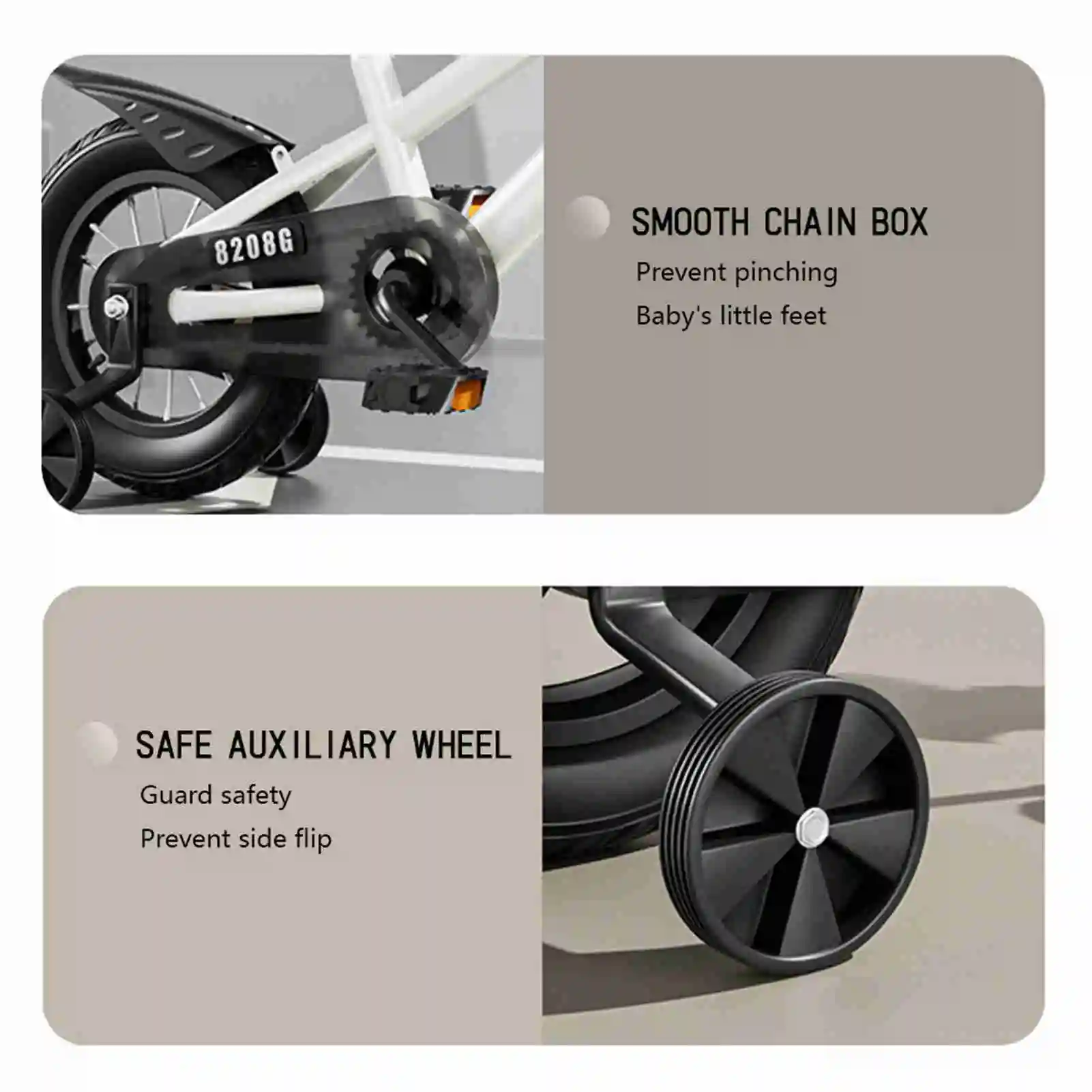 Ruedas auxiliares de seguridad: evitan que se voltee lateralmente y brindan estabilidad adicional.