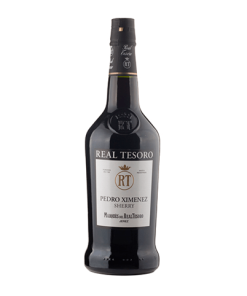 Real Tesoro Pedro Ximénez es un vino dulce elaborado por la bodega Marqués del Real Tesoro en la D.O. Jerez y Manzanilla-Sanlúcar de Barrameda. Producido a partir de uvas Pedro Ximénez sometidas a un proceso de pasificación, este vino destaca por su intensidad, cuerpo y dulzor natural. Ideal para acompañar postres o disfrutar solo como broche final de una comida. Presentado en botella de 75cl y con un volumen alcohólico del 17%.