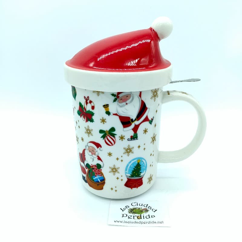 Taza filtro navidad. Varios modelos. Taza de porcelana, de 0,32 L. Incluye tapa y filtro de acero inoxidable.