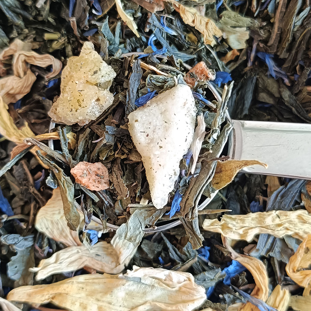 Ingredientes té verde mogo mogo: Té verde Sencha, plátano, mango, melón, aroma, hojas flor de la pasión, girasoles, guayaba, pétalos de aciano.